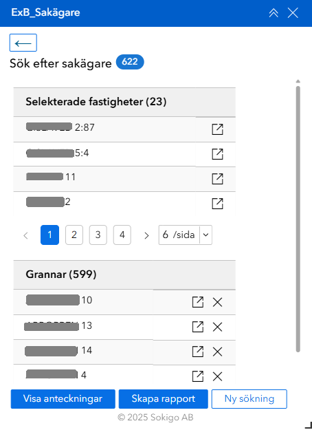 Om du väljer att utesluta någon fastighet från resultatet och denna är en delägare så kommer även berörda fastigheter att plockas bort från urvalet.